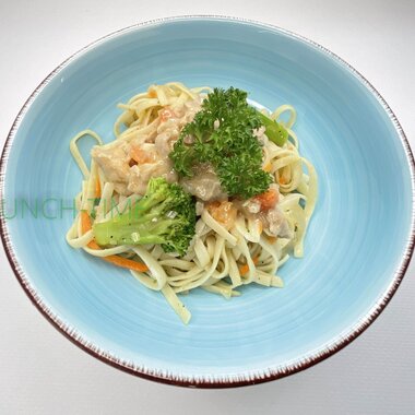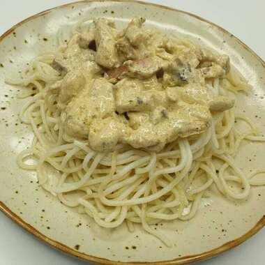 Паста с курицей в сливочном соусе (филе бедра куриное, сливки, паста том-ям, болгарский перец, лук репчатый, специи, спагетти 90/150 (1 шт)