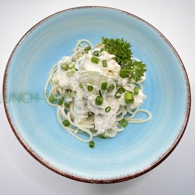 Спагетти с куриным филе в сливочном соусе с овощами (1 шт)
