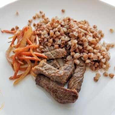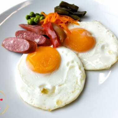 Яичница с охотничьими колбасками и паровыми овощами (1 шт)