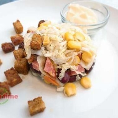 Салат "емеля" с копчёной колбасой и отдельной заправкой (1 шт)