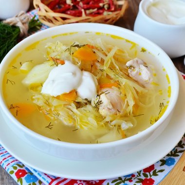 Щи из квашеной капусты с курицей и сметаной (300 мл)