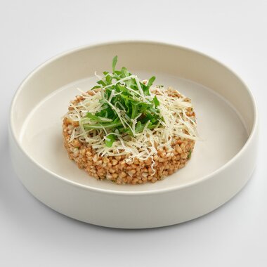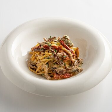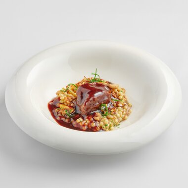 Телячьи щечки с птитимом и лесными грибами