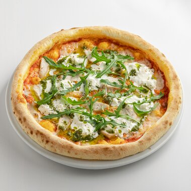 Пицца с куриным филе, песто и страчателлой