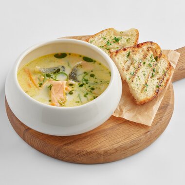Сливочная уха с лососем и сибасом