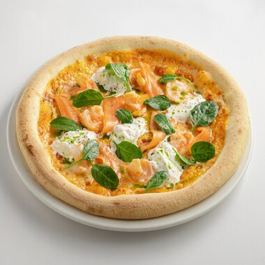 Пицца с лососем, креветками и cтрачателлой