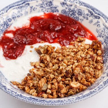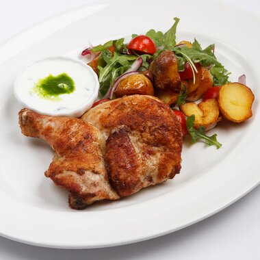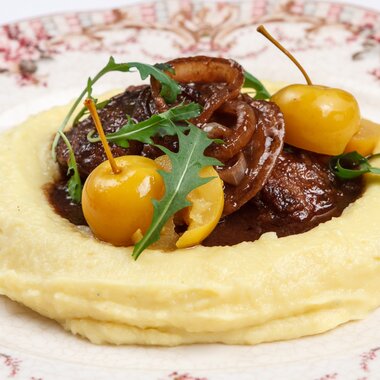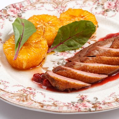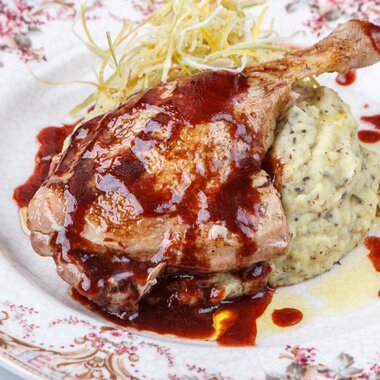 Томлёная утиная ножка с трюфельным пюре и ягодным соусом