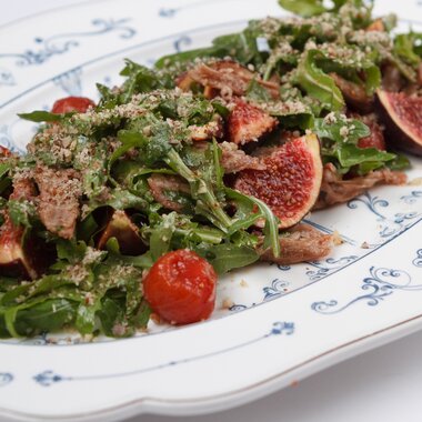 Салат из рукколы с пряной уткой, томатами и сладкими фигами