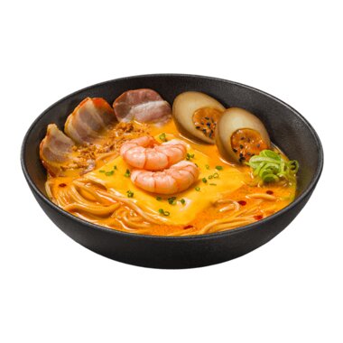 Сырный рамен с креветками и беконом
