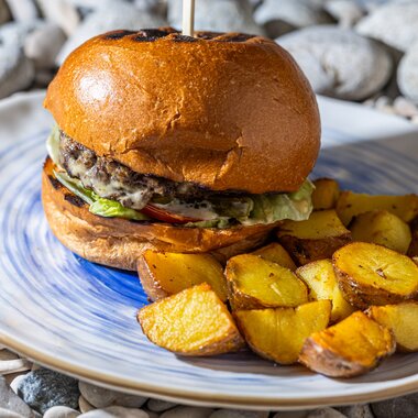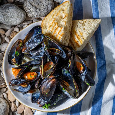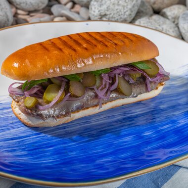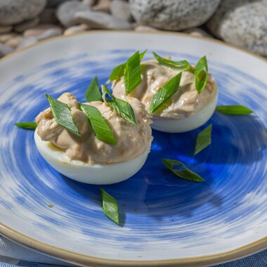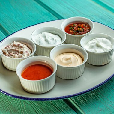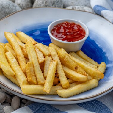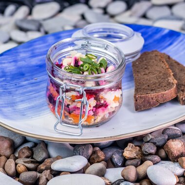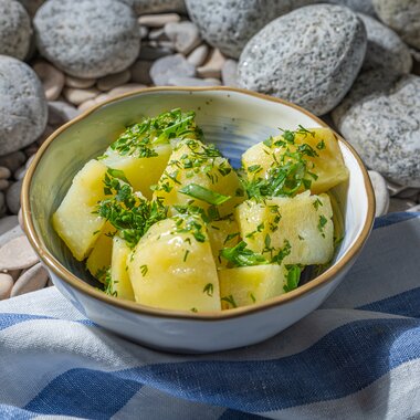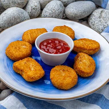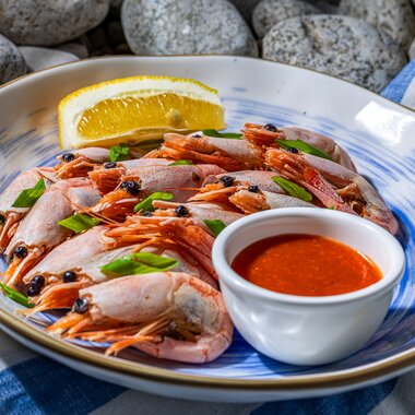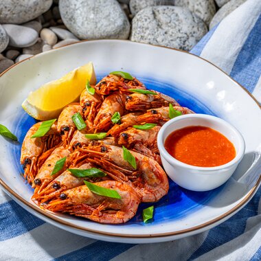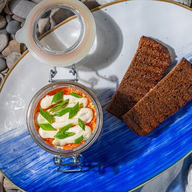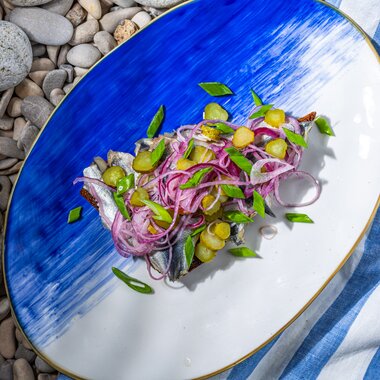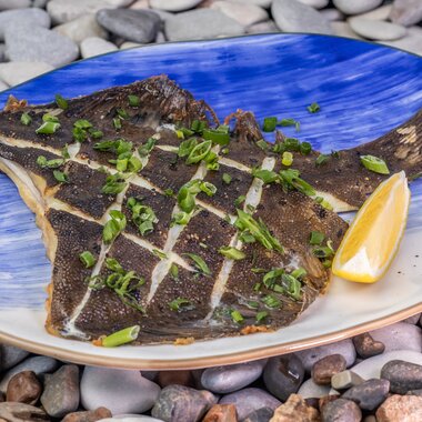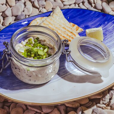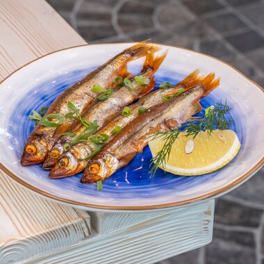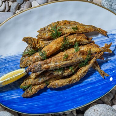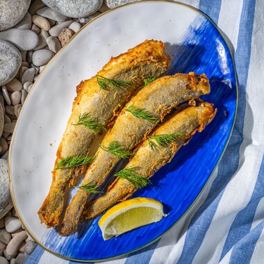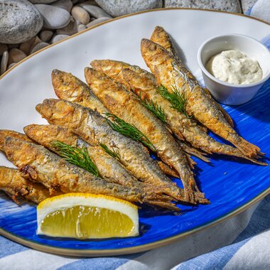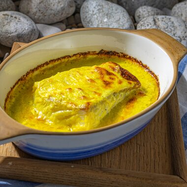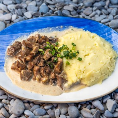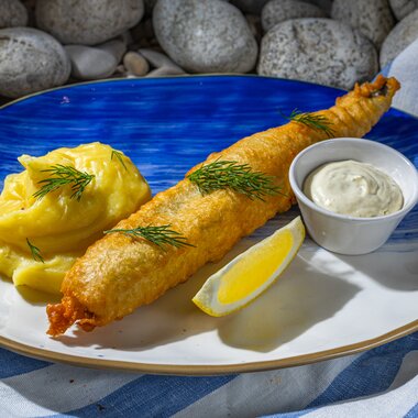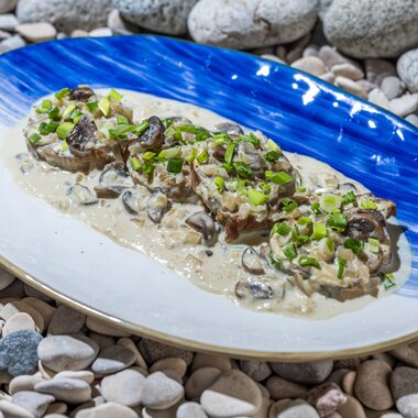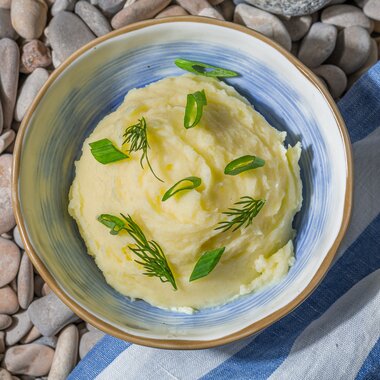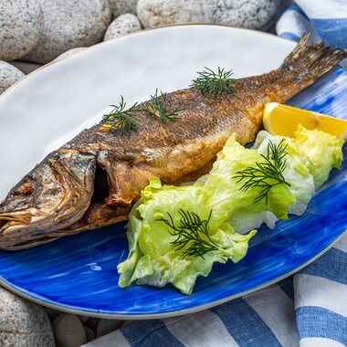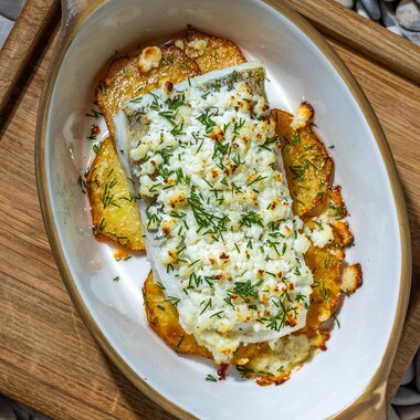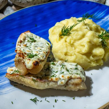 Окунь в сметане с чесноком и зеленью, подается с картофельным пюре