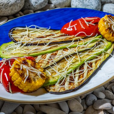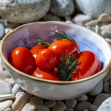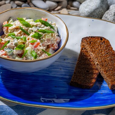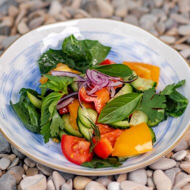Салат из двух видов помидор, огурцов, перца и крымского лука