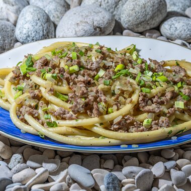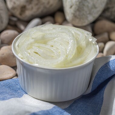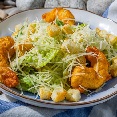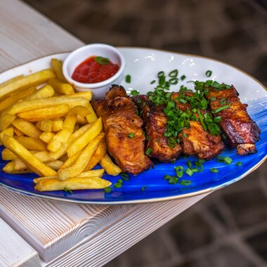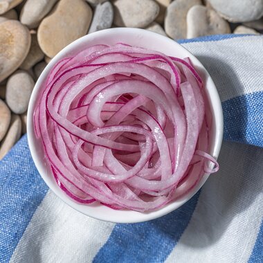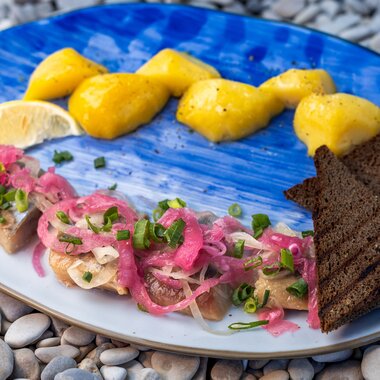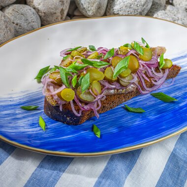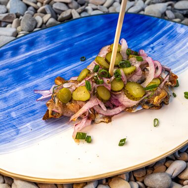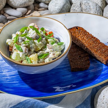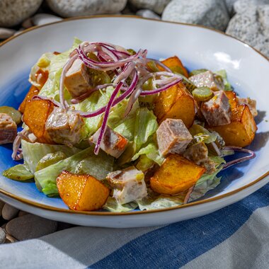 Салат с бужениной, жареным картофелем, корнишонами и красным луком