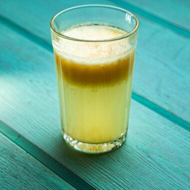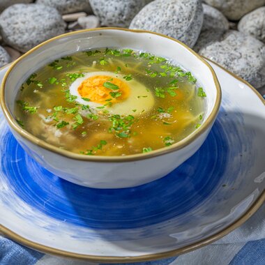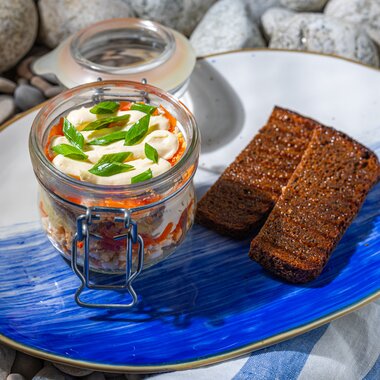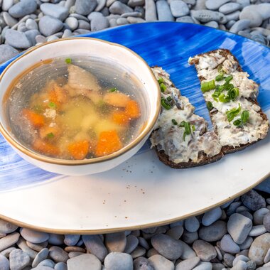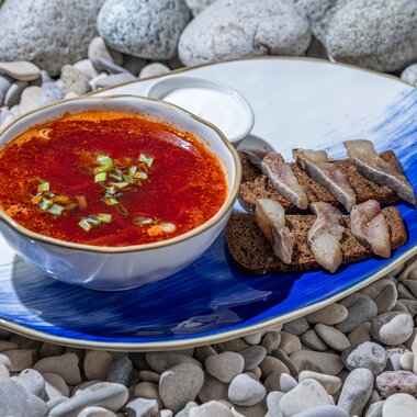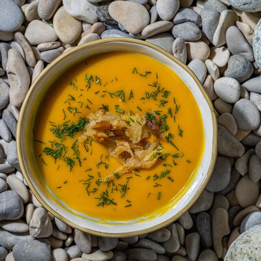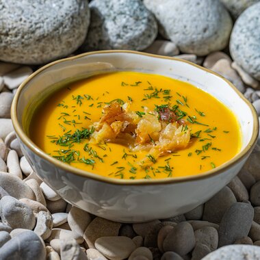 Крем-суп из пяти кореньев и тыквы с копченым окунем