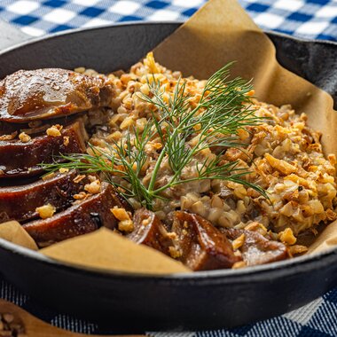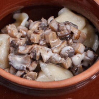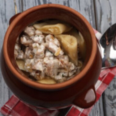 Вареники со шпинатом, сыром и ореховым соусом в горшочке