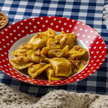 Вареники с картофелем, грибами и мясной поджаркой